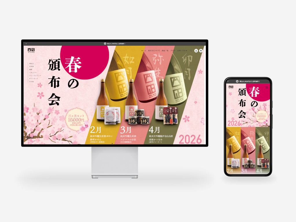コーポレートサイトとは切り分け、外部のネットショップサービスを活用してオンラインショップを新たに構築しました。商品ごとの魅力や用途が伝わる構成とし、初めての方でも迷わず購入できる導線を意識しています。日本酒の頒布会(定期便)も設け、継続的に楽しめる仕組みを取り入れました。