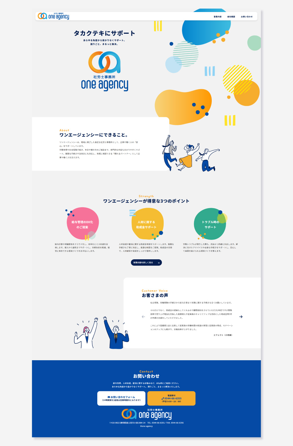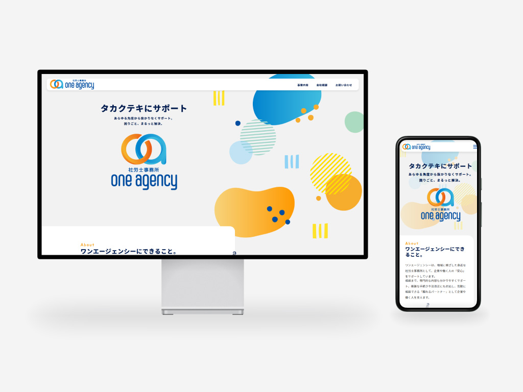 仕様 Wordpress スマートフォン最適化 URL https://one-agency.info/ 地域に根差した身近な社労士事務所というコンセプトから、堅い雰囲気にならないようイラストを多用したり、ロゴをベースに明るい色を使用しながらデザインを行いました。事業内容のページは文章量が多めですが、ここでもイラストを各項目に使用して、イメージのしやすさを心がけています。